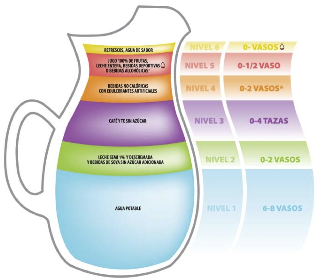 Cuenta con 6 niveles, en los que se ubican diferentes bebidas y se sugieren las cantidades que debe tomar un adulto cada día. La recomendación de las bebidas se basa en los beneficios que le proporcionan al cuerpo, por lo que la cantidad sugerida se encuentra en el lado derecho del gráfico en forma de vasos o tazas.