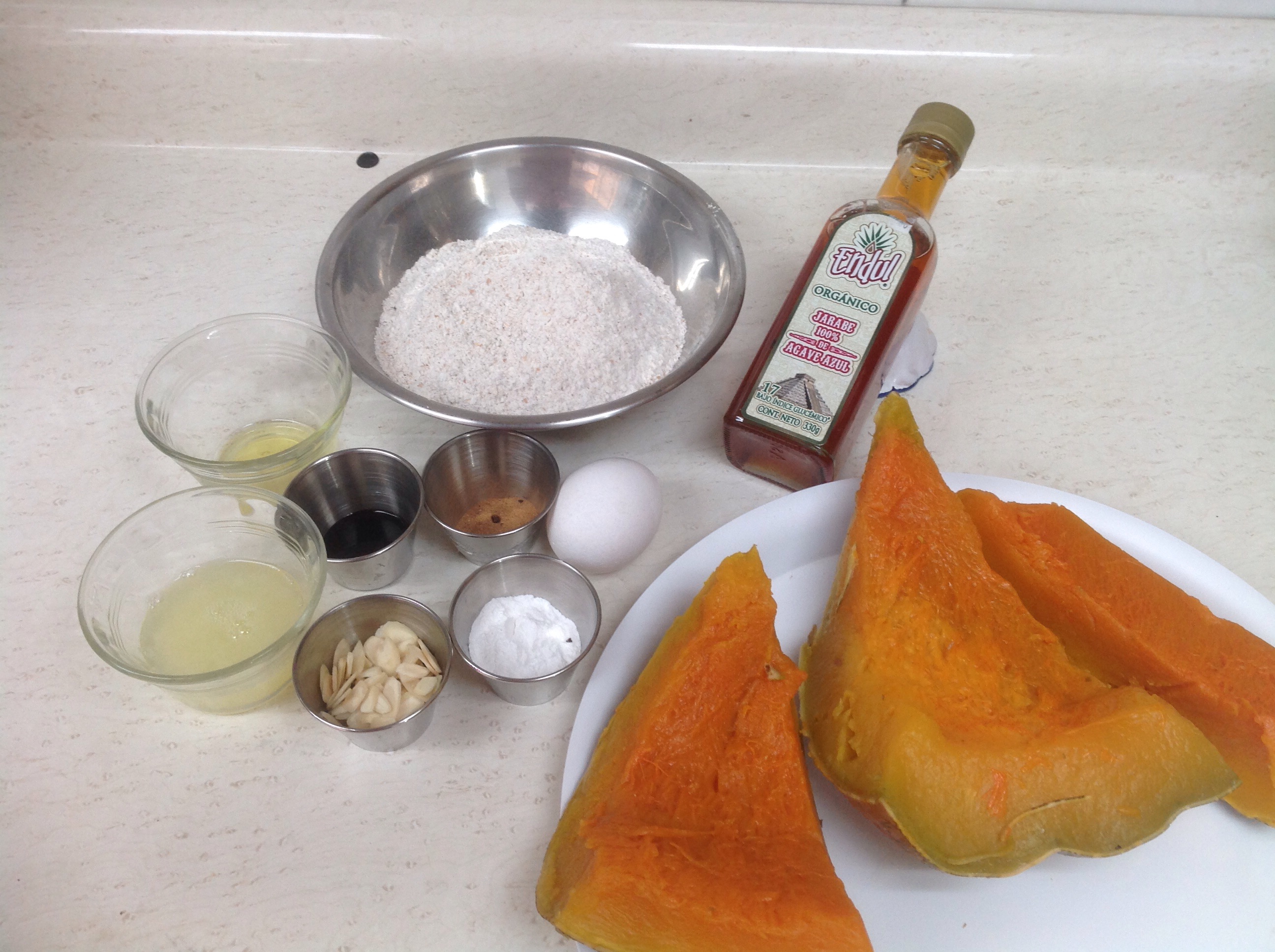 Se consigue en las fruterías la calabaza ya partida, pues la cáscara es muy dura, hay que quitarle las semillas, y cocerla en olla exprés con 1 1/2 tazas de agua, por menos de 10 miutos, la cantidad que ven en la foto alcanza para 3 tazas de puré y la dejé 7 minutos en la olla exprés. Una vez cocida, se elimina la cáscara y la pulpa se licúa en la licuadora con un poco de agua.