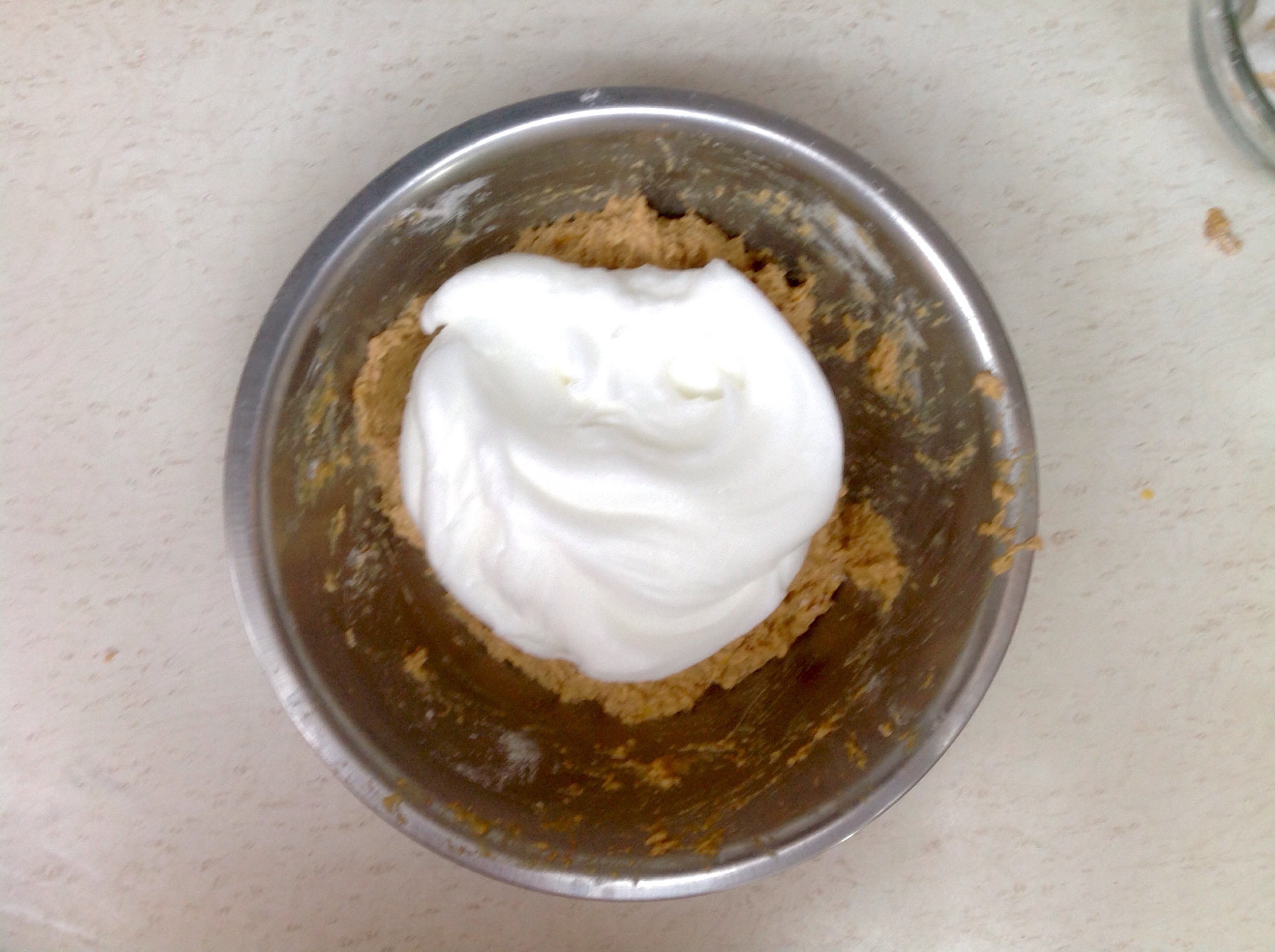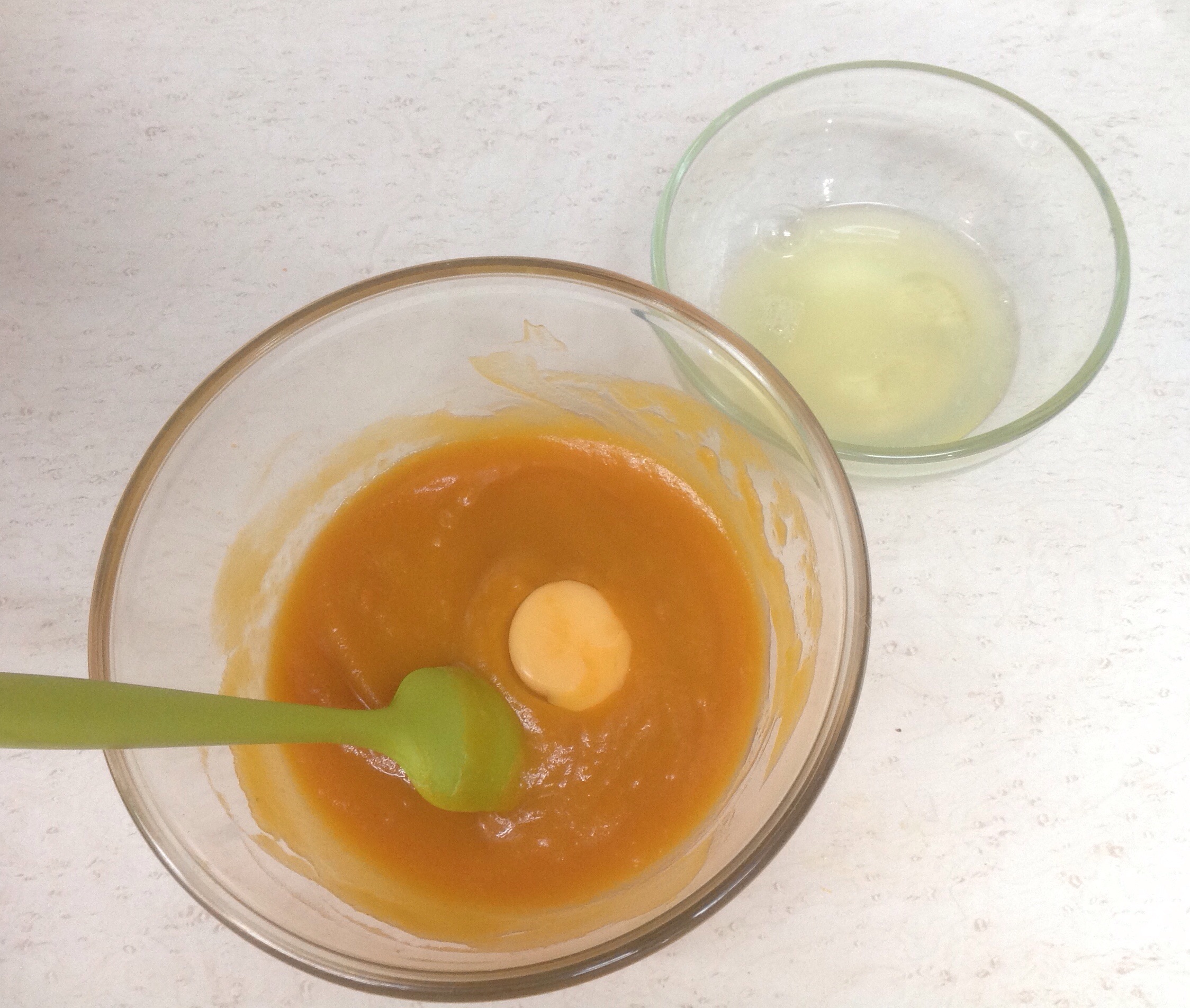 2.- Se mezcla el puré de calabaza, la esencia de vainilla, el aceite de oliva, la miel de agave y la yema de huevo, separa la clara en un recipiente aparte, y bate con las otras 2 claras a punto de listón.