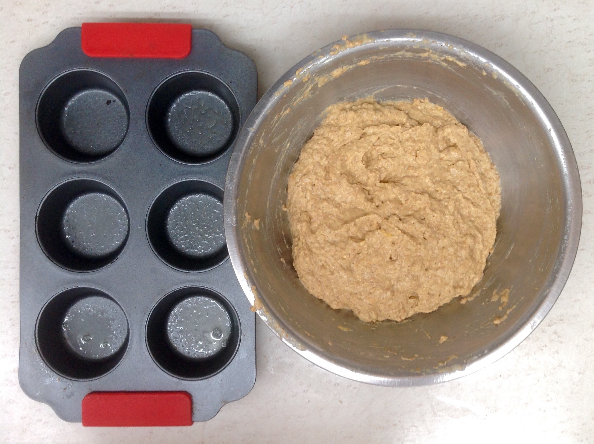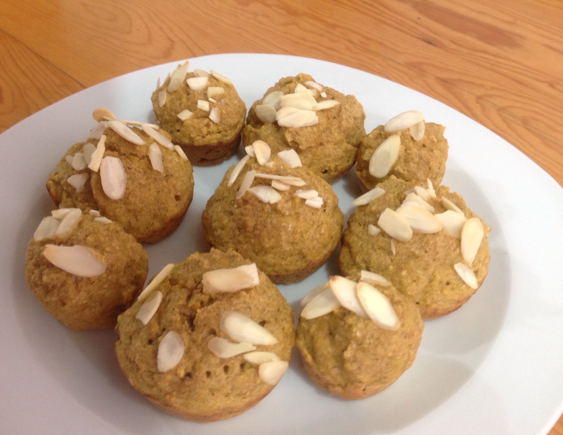 4.- Una vez que se tiene una mezcla uniforme se vacía en moldes previamente engrasados, yo utilicé 2 disparos de aceite en aerosol, y se lleva al horno, se decora con almendras, el horno hay que precalentarlo por 20min a 180 grados, se cocen por 10min a 180 grados.