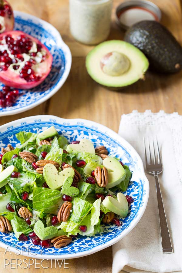 Puedes preparar una ensalada tan deliciosa que igual de saludable como es lo es la siguiente, lo único que necesitas es lechuga, nuez, granada y aguacate, compra un molde de corazón como los de galletas y con él corta el aguacate para que quede de esa forma, puedes agregar algún aderezo