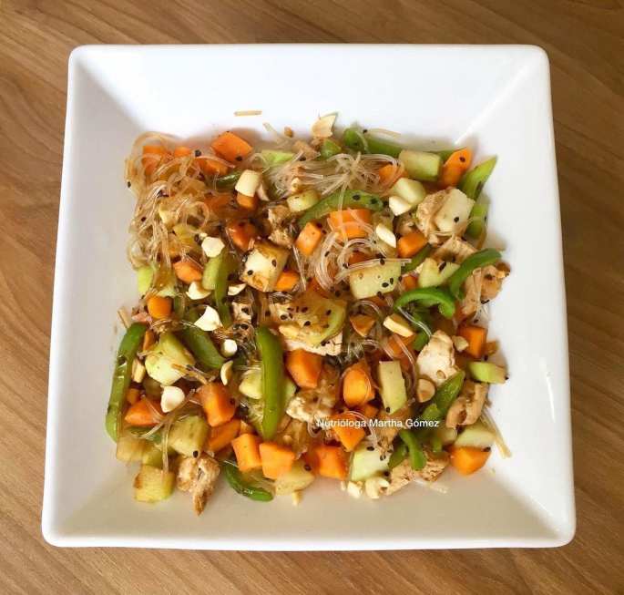 Pollo con verduras y fideos de arroz